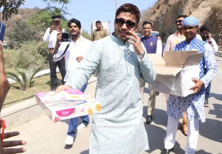 After the marriage ceremony, Rashmika and Vijay’s group distributed candy bins to the paparazzi and followers gathered outdoors the venue. A video of the gesture has surfaced on-line, displaying sweets being handed out not solely to media personnel but additionally to underprivileged kids ready close to the venue. The candy bins reportedly featured an image of Rashmika together with the phrase “Prabhuji” printed on them, including a personalized effect to the celebration.